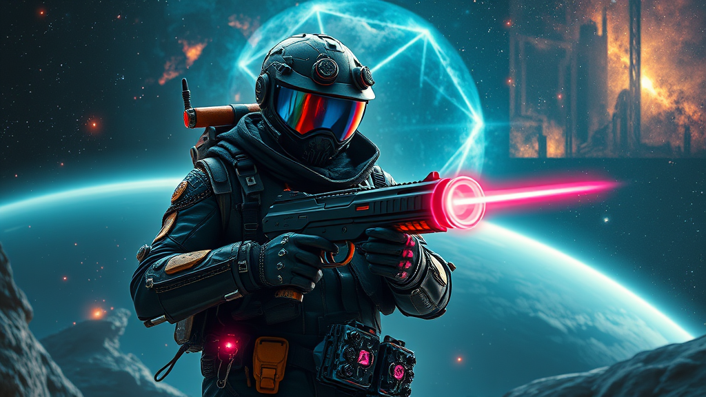 Space renegade exploring a futuristic frontier, a sci-fi western fusion featuring a stylized space bounty hunter clad in intricately detailed attire. Wielding a plasma revolver, their cybernetic enhancements and high-tech gadgets gleam with vivid colors against the backdrop of breathtaking nebulas. The dynamic composition captures the essence of a cosmic odyssey, blending steampunk and cyberpunk elements. Glowing accents and detailed textures enhance the ultra-realistic scene, evoking the epic atmosphere of a space opera. This striking Neo-Noir depiction embodies a captivating fusion of genres, realized in stunning 4K detail.
