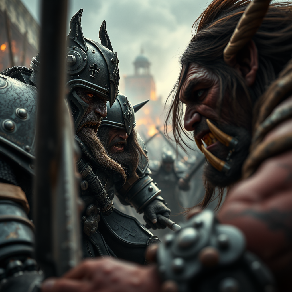 Space Wolves Space Marine engaging with Orcs on a vast battlefield, intense action, cinematic scene, dramatic lighting, highly detailed and realistic, masterpiece, sharp focus, 8k, UHD, HDR, showcasing textured skin and remarkably detailed pupils, captured in a studio with a 16mm cinematic camera. Incorporating the presence of a woman in the scene to add depth and narrative.