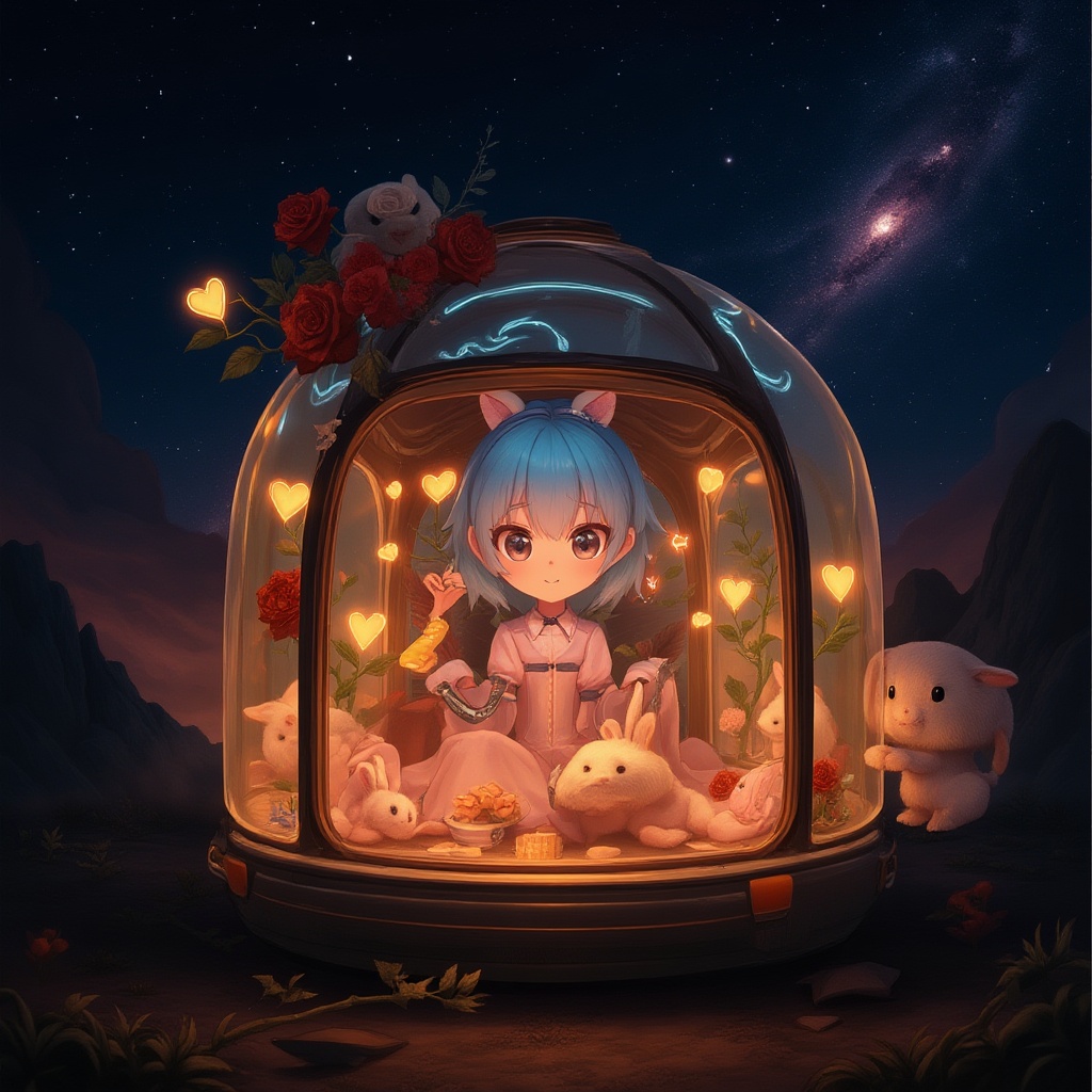 A futuristic spacecraft adorned with heart-shaped decorations and blooming roses features transparent walls offering unobstructed views of stars and galaxies. Inside, a holographic display illuminates a cozy, sleek interior with advanced cybernetic implants subtly enhancing the atmosphere. Playful rabbits frolic in this romantic setting, while warm lighting highlights a beauty with adorable blue hair, her presence radiant against the backdrop of far-off planets and alien landscapes. The cinematic light casts a hyper-realistic glow, captured in stunning detail with an 8k resolution through a 35mm f1.4 lens on Fuji color film, portraying an enchanting scene of warmth and allure without the need for space uniforms.