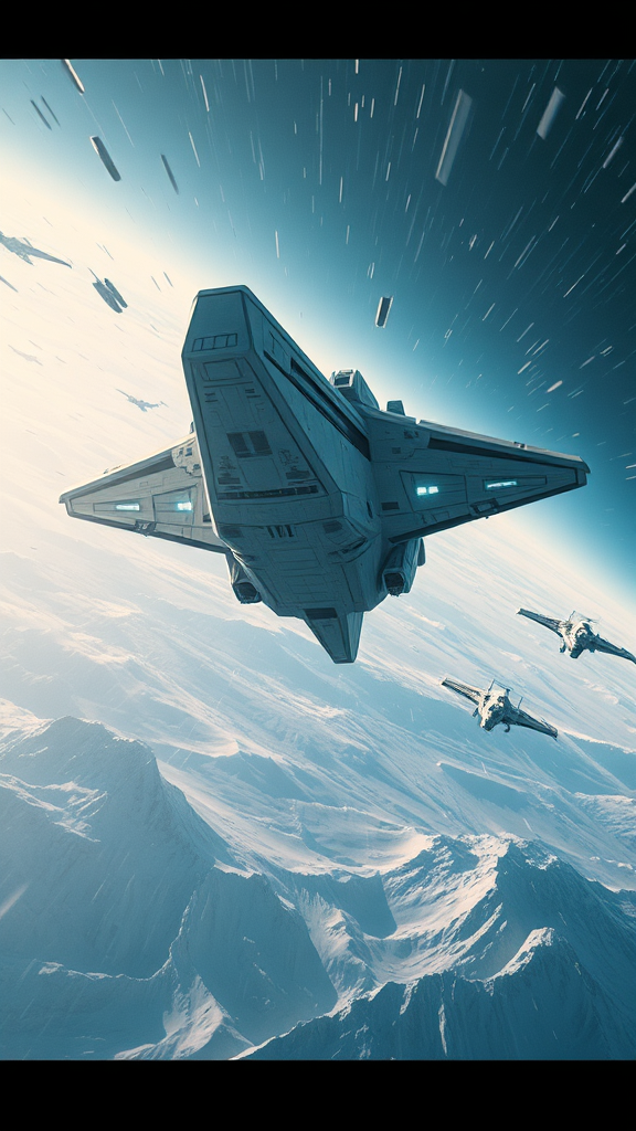 Spacecraft engaged in dynamic motion, inspired by Star Wars, captured in the style of Olympus AF-1, cinematic stills showcasing light gray and blue hues. Stunning beauty in fragmented planes with light gray and dark emerald tones, reminiscent of Frostpunk. A spaceship emerges into view from a distance, crafted in #vfxfriday style with changelingcore and IMAX influences, offering a breathtaking close-up. The color palette features light indigo and white, rendered in 32k UHD, blending photo realism and digital art in a captivating science fiction scene.