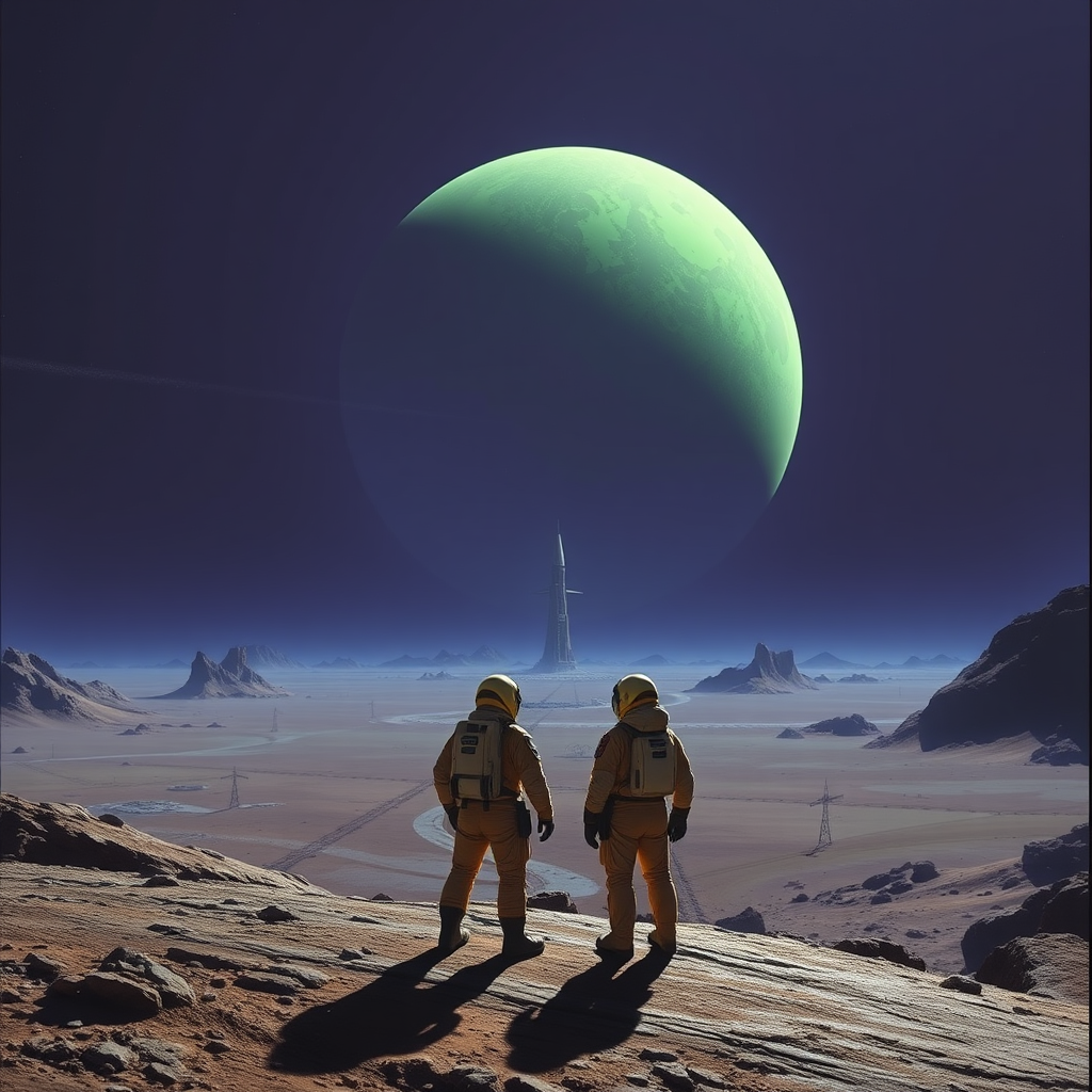Spacecraft "Erebus" on Xylophia-IV, a moon of the gas giant Zorvath. Two astronauts, Captain Ortega and Dr. Patel, stand at the edge of the alien landscape, a massive structure in the distance. The sky is a deep shade of indigo, with the green gas giant looming large in the background, casting an otherworldly glow.