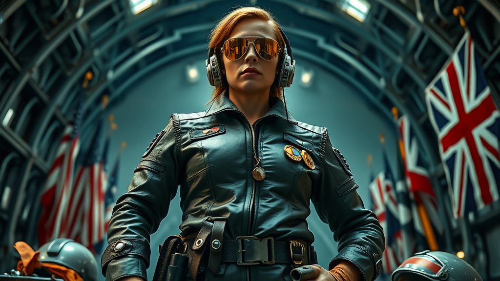 spacecraft hangar heroic female mechanic dressed in an intricately detailed formal Oak Cool Pewter leather uniform, embodying a sci-fi and futuristic cyberpunk aesthetic. She proudly displays medals on her chest and wears a utility belt packed with tools, standing under dramatic cinematic lighting that casts dynamic shadows. Captured from a low angle shot, she strikes a dynamic action posture, emphasizing her skills and determination. Her eyes are shielded by golden pilot sunglasses, with highest facial details reflecting mastery and focus, rendered in an 8k masterpiece resolution. Around her, realistic fabric details and folds are visible, adding to the authenticity. The background is simple, with low contrast, avoiding unnecessary noise, allowing the scene's elements to stand out. A helmet rests nearby, alongside hard surfaces and flags, featuring both stars and stripes and the Union Jack, subtly placed in the backdrop.