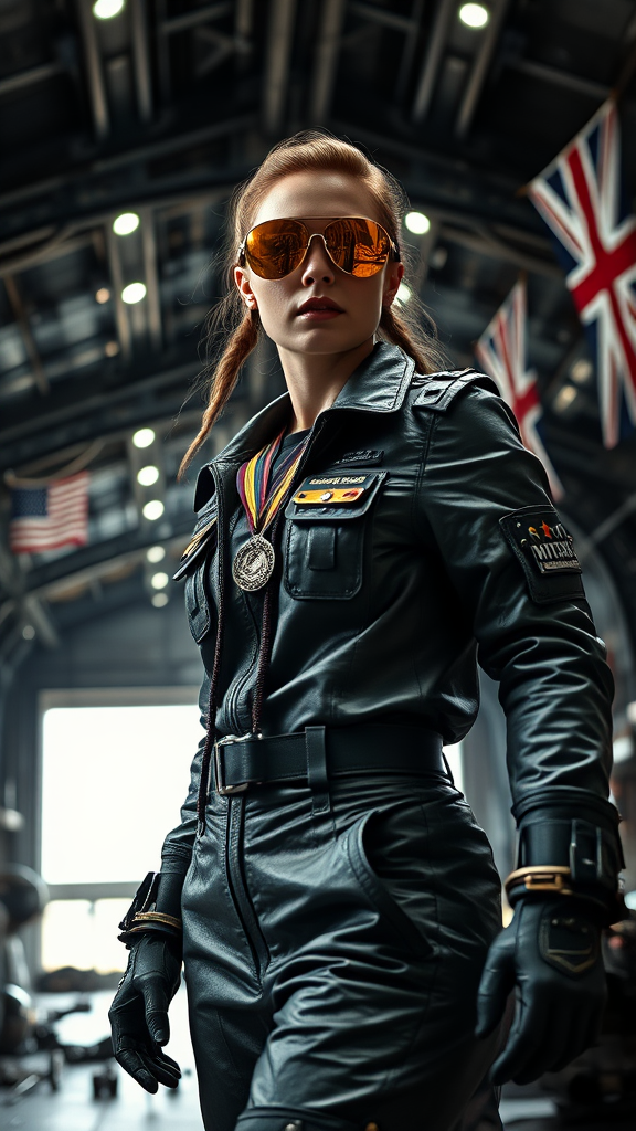 Spacecraft hangar, heroic female mechanic in an intricate, highly detailed formal Oak Cool Pewter leather uniform, blending sci-fi and cyberpunk aesthetics. She wears medals and a utility belt, and is captured in dramatic cinematic lighting from a low angle, accentuating her dynamic action posture. Her golden pilot sunglasses reflect the hangar's lights, and her face shows the highest facial details, a true masterpiece in 8k resolution. The scene is dark, with realistic fabric details and folds on her uniform. The background is simple and slightly monochrome, ensuring focus remains on her, while low contrast avoids distractions. Tools are scattered around, and a hard-surface helmet rests nearby. Flags, including stars and stripes and union jack, subtly accentuate the background, alongside a gentle hint of a cosmic theme, while maintaining a balance of realism and artistic flair.