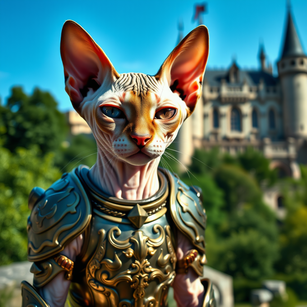 Sphynx cat in ornate armor standing outdoors with a majestic castle in the background, captured in a RAW photo with sharp focus using a DSLR camera in 16k resolution. The image is in ultra-high-definition with high dynamic range, showcasing a clear day with vivid colors. The cat has a unique expression with slightly crossed eyes, and its armor reflects the natural light beautifully. The background features lush greenery and the imposing architecture of a medieval castle, giving a sense of grandeur and fantasy. The photograph is free from any digital imperfections, extraneous elements, or text overlays, emphasizing a clean and striking visual composition.