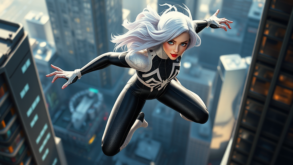 Spider Gwen leaps gracefully through a futuristic cityscape, her dynamic pose capturing the essence of acrobatic agility. Her white hair flows with momentum, styled in a cute loose bob that frames her face perfectly. Her red lips add a striking contrast to her costume, highlighting her determined expression. With a lean and toned physique, she effortlessly maneuvers through the scene. The dramatic lighting casts sharp shadows that enhance the tension and energy of the moment. This visual feast is captured in ultra-high resolution, bringing every detail to life through physics-based rendering, creating a breathtaking depiction of power and elegance.