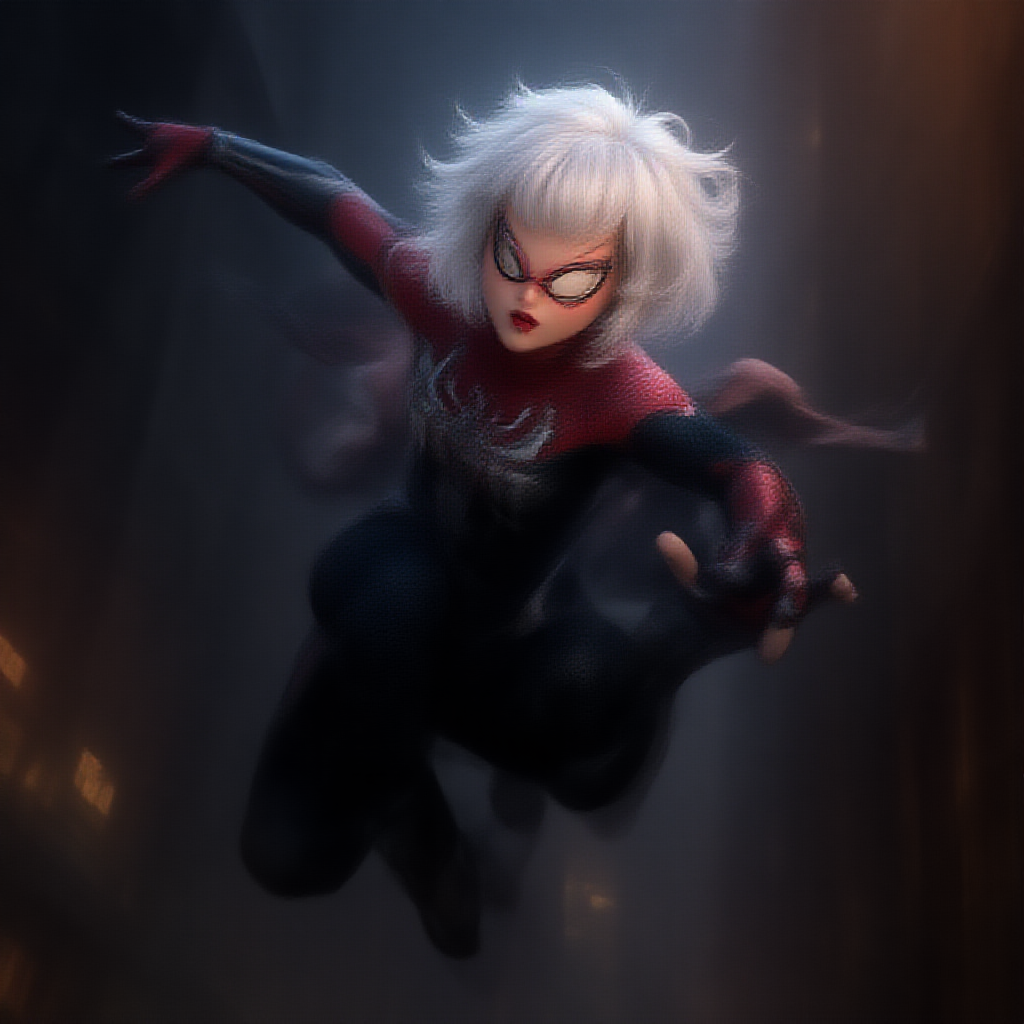 Spider Gwen leaps through the cityscape in an action-packed scene, her dynamic pose showcasing agility and strength. She sports iconic white hair in a cute loose bob hairstyle, her look completed with striking red lips. Her form is toned and athletic, embodying both grace and power. The dramatic lighting casts sharp shadows, accentuating the high-octane energy of the moment. Captured in ultra-high resolution with physics-based rendering, every detail is vibrant and lifelike, from the textures of her suit to the tension in her muscles as she maneuvers through the air.