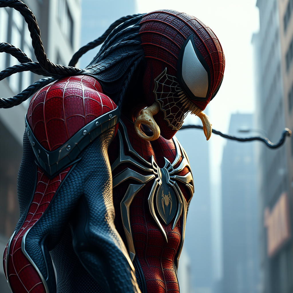 spider-man bonded with venom symbiote, hyper realistic, highly detailed, 8k resolution, cinematic style, with subtle creative twists like swirling tendrils and a shadowy urban backdrop, --ar 9:16