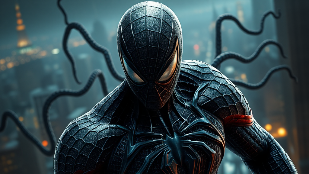 Spider-Man in a venomized form, rendered in ultra-realistic detail, capturing every sinew and texture in 8k resolution with a dynamic 9:16 aspect ratio, features intricate patterns of the symbiote weaving across his suit, a dramatic interplay of light and shadow highlighting the duality of his transformation, eyes glowing with an otherworldly intensity, set against a backdrop of a cityscape shrouded in darkness, with tendrils of the symbiote creeping into the scene, infusing the environment with a sense of tension and raw power.