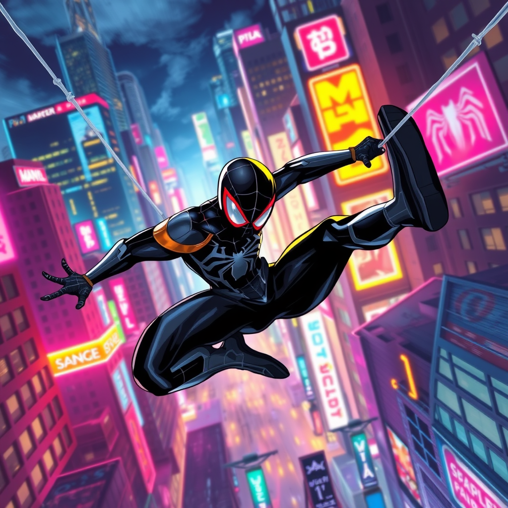 spider man, Miles Morales swinging through a vibrant cityscape, dynamic comics style art, highly detailed, nighttime setting with neon lights, capturing motion and energy, sleek futuristic suit, --ar 9:16