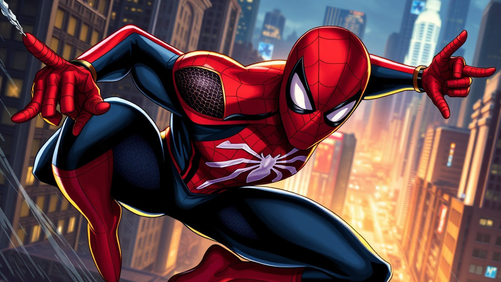 Spider-Man, Miles Morales, vibrant comic art, highly detailed render, dynamic motion, cityscape background, sleek modern suit design, intense action pose, atmospheric lighting, expressive facial features, city at night, urban energy, ar 9:16
