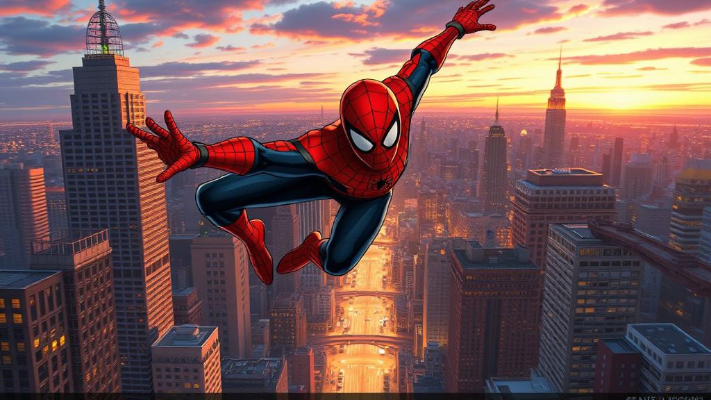 Spider-Man swinging through a bustling cityscape, featuring Miles Morales in dynamic motion, comic art style, vibrant colors, high detail, dusk setting illuminating the skyline, energetic and action-packed atmosphere, --ar 9:16