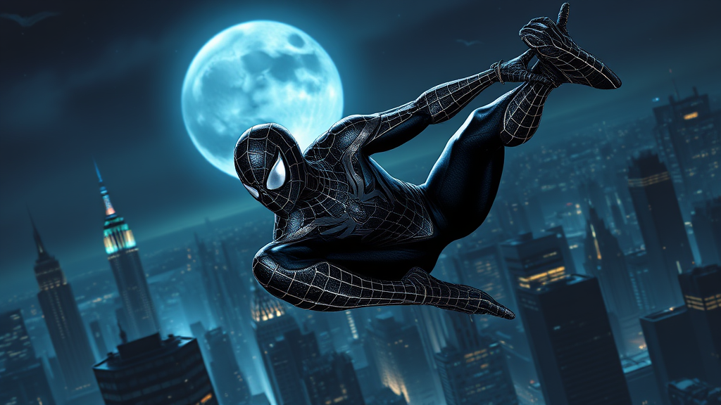 Spider-Man swings through the shadowy skyline of Gotham City, his suit shimmering like liquid metal, infused with ferrofluid that responds to his every move. The intricate webbing of the material glistens under the moonlight, allowing for both agility and protection as he navigates the city's towering structures and darkened alleys with precision and speed.