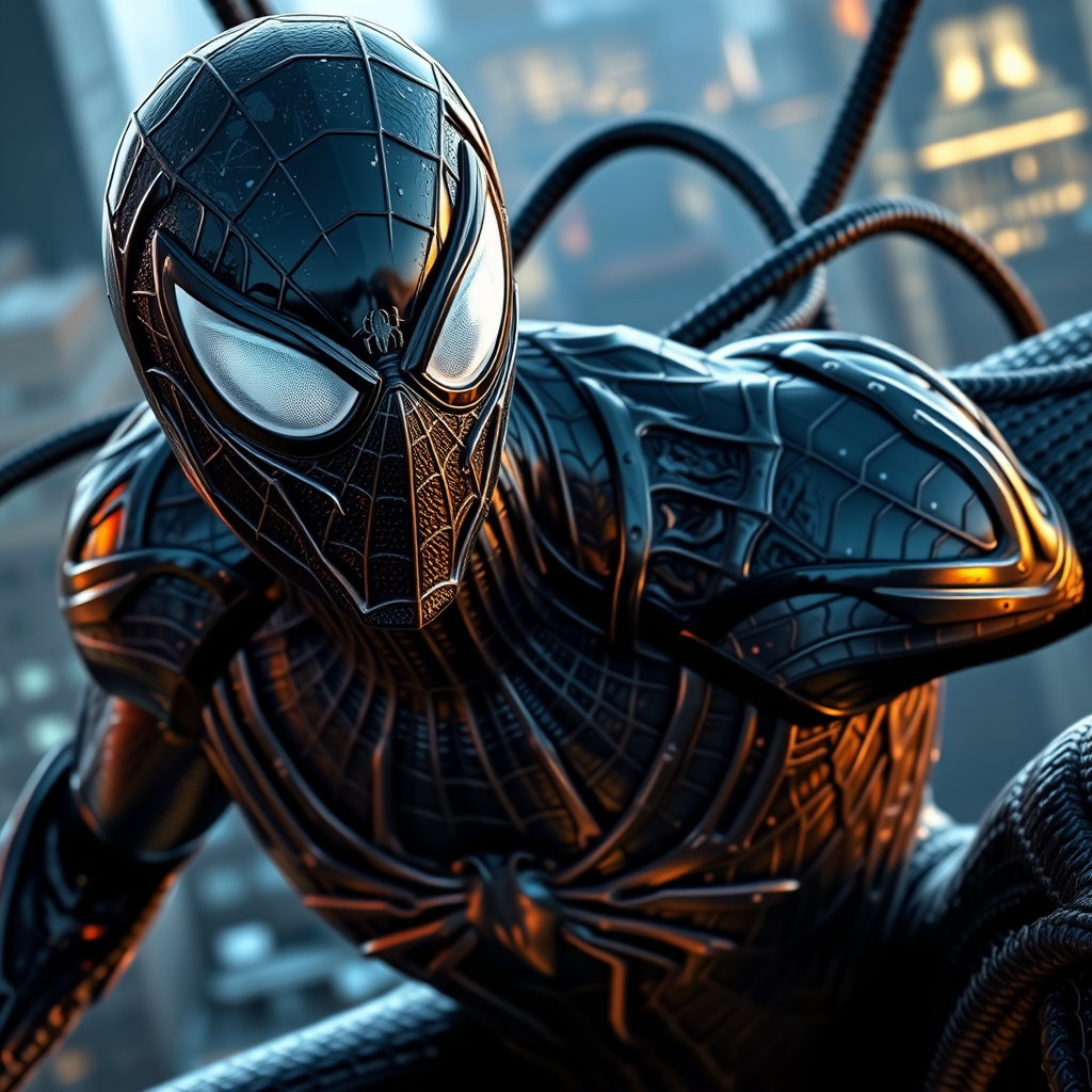 spider-man symbiote fusion, hyper-realistic, meticulously detailed, 8k resolution, cinematic aspect ratio 9:16, intricate web patterns with dark, glossy textures, intense expression with glowing eyes, city skyline backdrop reflecting in his suit, dynamic pose conveying motion and power, hints of underlying struggle between man and alien symbiote.
