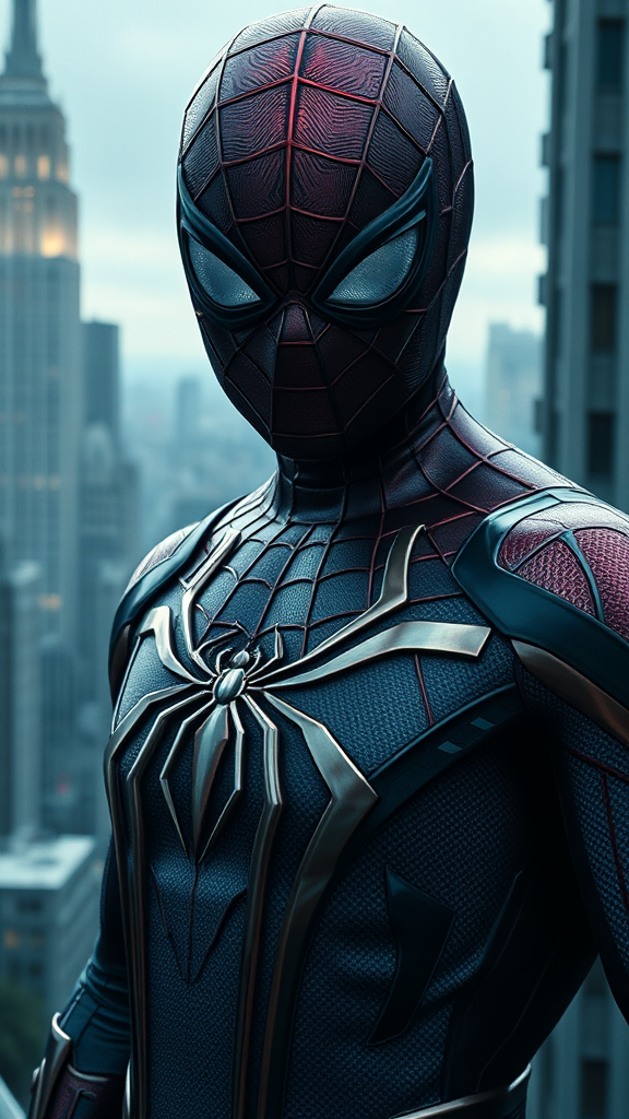 Spiderman, crystal-clear detail, sleek liquid-metal suit, intricate texture, Gotham City backdrop, ultra-high-resolution vibrant imagery, moody, shadow-laden, intense contrast, cinematic 8k quality.