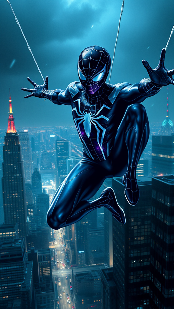 Spiderman in crystal-clear detail, donning a sleek ferrofluid suit, swinging through the dark, towering skyline of a Gotham-inspired metropolis.