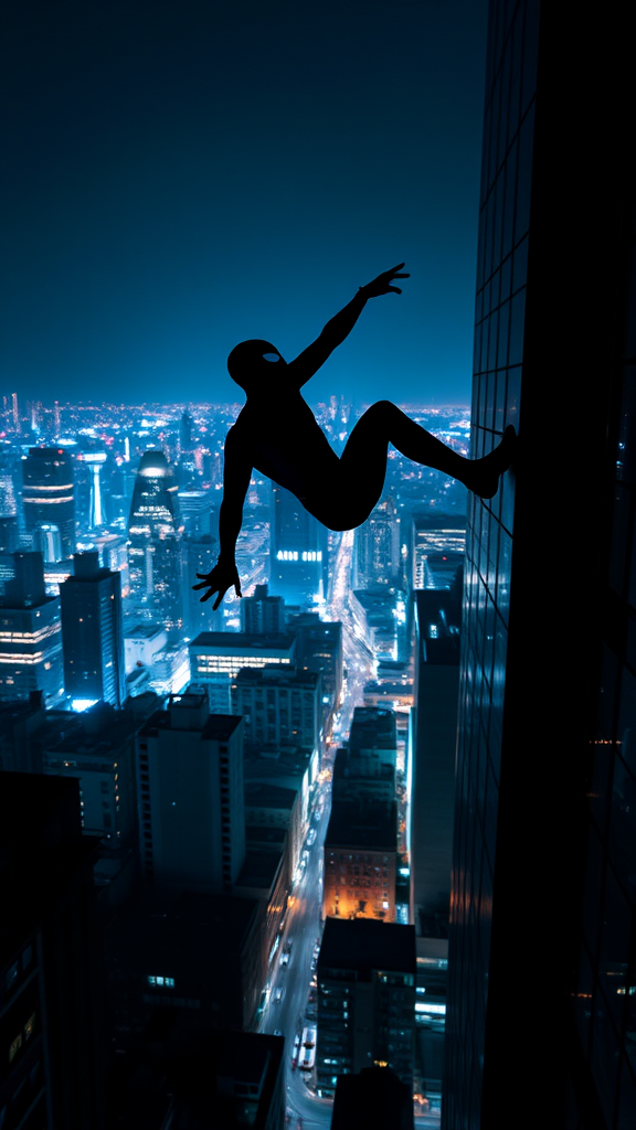 Spiderman in his sleek black suit is dramatically silhouetted against the sprawling nighttime metropolis, effortlessly clinging to a towering building with one powerful hand. The bright lights of the city and its towering skyscrapers cast a luminous glow over the urban landscape, highlighting the dark shadows and alleys below. Captured with a Canon EOS R5 and Canon RF 24-70mm f/2.8L lens, the scene is set at ISO 200 with an aperture of f/2.8, and a shutter speed of 15 seconds. The white balance is set to auto, utilizing a Manfrotto MT055CXPRO4 tripod and a Canon BR-E1 remote shutter release. Experimenting with low-angle shots and creative framing further emphasizes Spiderman's silhouette against the vibrant cityscape, adding a dynamic and slightly abstract element to the iconic hero's presence.