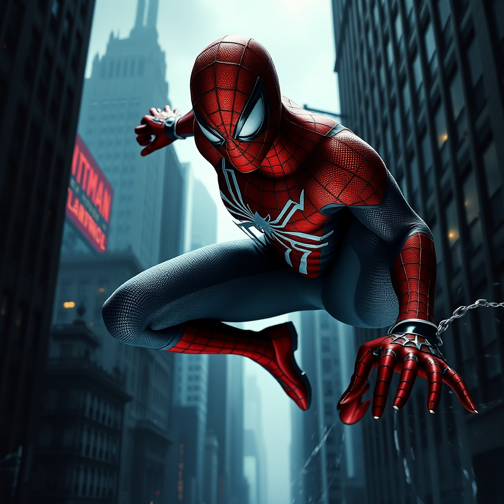 Spiderman in sharp focus, clad in a ferrofluid-enhanced suit, navigating the shadowy depths and towering architecture of Gotham City, blending agility with the city's dark atmosphere.