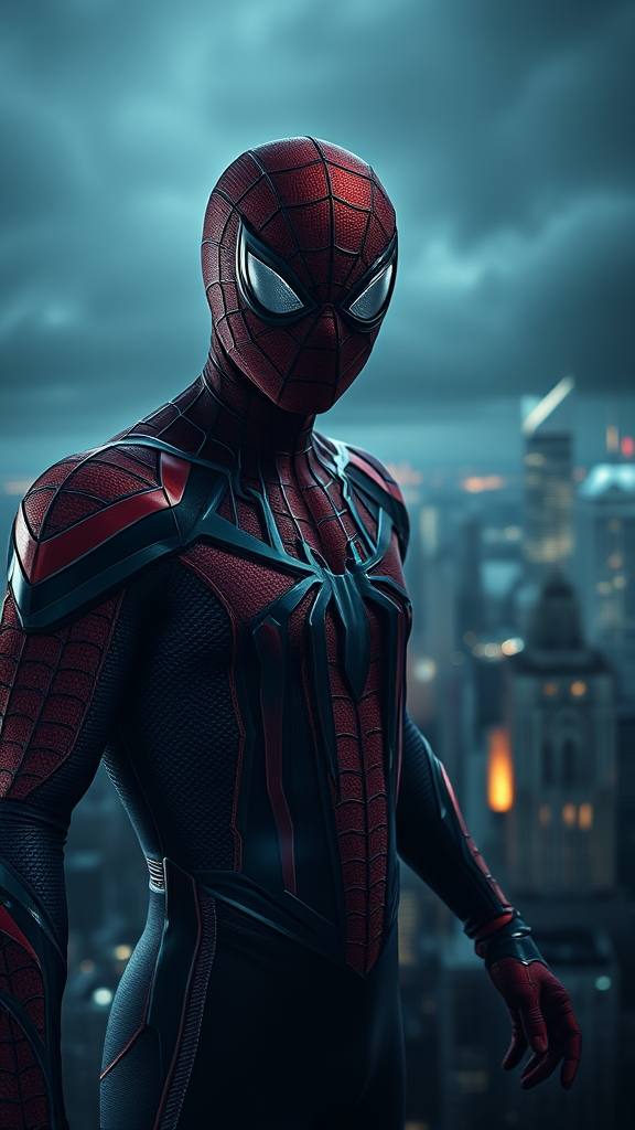 Spiderman in ultra-sharp focus wearing a sleek ferrofluid-inspired suit, textured with fine detail, set against the moody backdrop of a Gotham City-like skyline. A richly colored, high-quality photo capturing the dark ambiance and shadowy depths, with striking high contrast and vivid 8k resolution, enhanced by the interplay of light and shade as it dances across the scene.