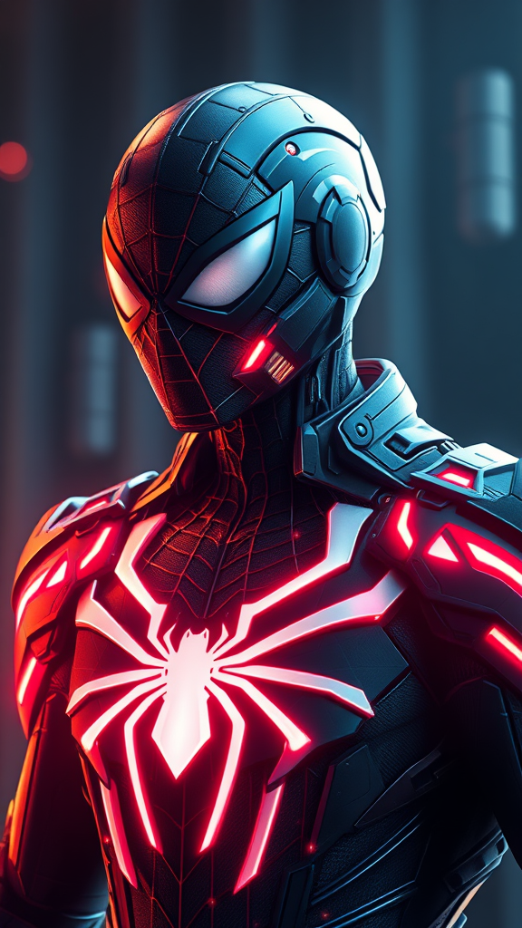 Spiderman portrait in cybernetic heavy armor, sci-fi setting, glowing intricate details, full body depiction, elegant and highly detailed, digital painting, concept art inspired by Artstation, smooth texture with sharp focus, art by artists like Artgerm, Greg Rutkowski, and Alphonse Mucha. It retains a majestic and visually captivating essence, steering clear of low-resolution effects, text errors, or any visual artifacts. The image avoids duplication errors, maintaining correct anatomy with no deformities or unnatural limb configurations. The design should balance futuristic elements while preserving Spiderman's iconic look, ensuring clarity and artistic finesse.