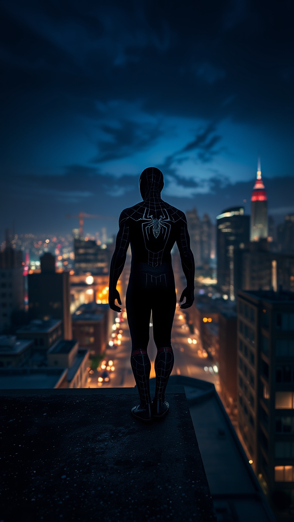 Spiderman standing at the edge of a Gotham City rooftop, sharp focus piercing through the dark atmosphere, tight ferrofluid suit glistening with tiny, iridescent specks of metallic dust, texture of the concrete beneath his feet palpable in the foreground, deepest blues and purples of the Gotham City night sky swirling above, high-contrast shadows accentuating every curve and angle of Spiderman's agile physique, every detail rendered in stunning 8k resolution, rich, velvety darkness providing the perfect backdrop for the faint, golden glow of city lights reflected on the wet pavement below