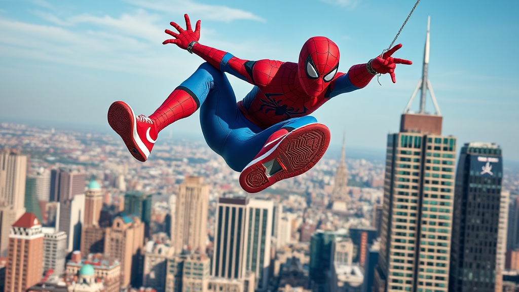 Spiderman swinging through the city skyline wearing sleek Nike Air Jordan sneakers, vibrant colors catching the light as he flips mid-air, urban landscape in the background, dynamic motion frozen in a moment of agility, iconic superhero blending athletic prowess with stylish flair.