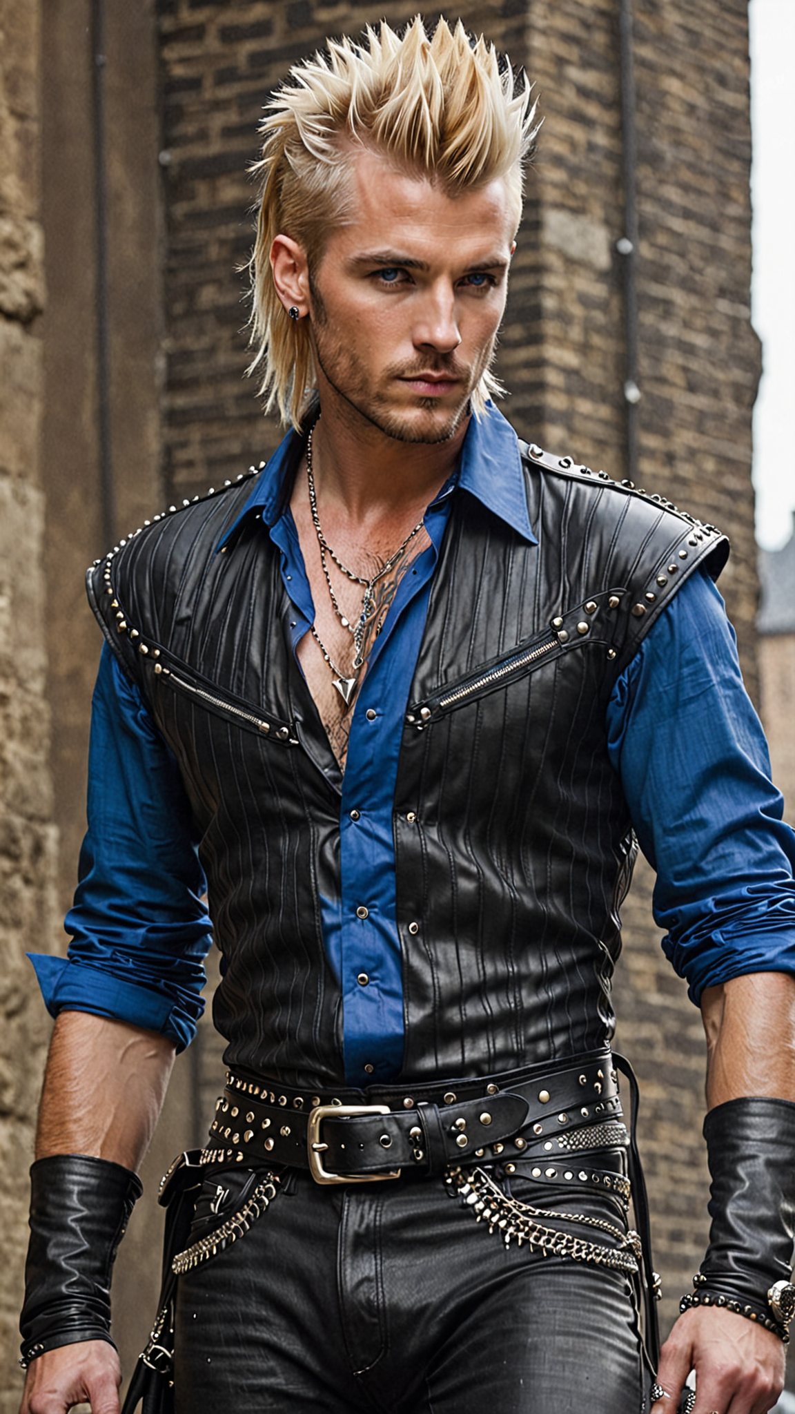 Spindle is a Punk, but he has some flair and style. He carries a fancy silver rapier sword that he can poke holes into his targets. He is tall, lithe, sinewy and thin, but very dexterous with lightning reflexes. Caucasian male with golden blonde hair in a spiky Mohawk mullet, thin on the sides and longer on top. He has bright blue streaks towards the front of his hairstyle. He has bright blue eyes and usually a smirk on his face. He wears a sheer royal-blue fishnet shirt and black leather jeans with a studded loosely double-wrapped belt around his waist and pointed toe black leather boots. He sometimes wears a little eye liner and eye make-up, Punk Rock style, of course. He is a mercenary, but he looks more like a rock star than a supervillain.