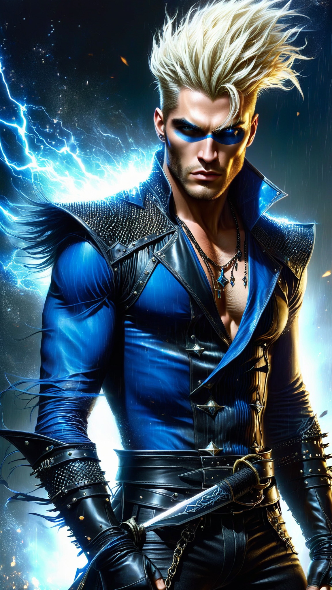 Spindle is a Punk, but he has some flair and style. He carries a fancy silver rapier sword that he can poke holes into his targets. He is tall, lithe, sinewy and thin, but very dexterous with lightning reflexes. Caucasian male with golden blonde hair in a spiky Mohawk mullet, thin on the sides and longer on top. He has bright blue streaks towards the front of his hairstyle. He has bright blue eyes and usually a smirk on his face. He wears a sheer royal-blue fishnet shirt and black leather jeans with a studded loosely double-wrapped belt around his waist and pointed toe black leather boots. He sometimes wears a little eye liner and eye make-up, Punk Rock style, of course. He is a mercenary, but he looks more like a rock star than a supervillain.