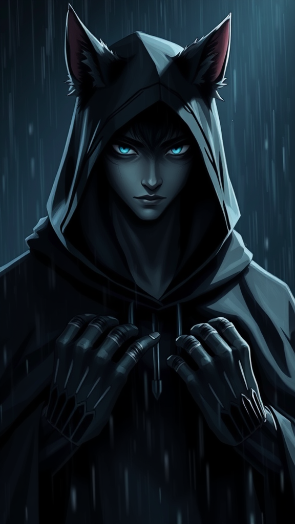 Splash art of a male furry with sleek black fur, dressed in a hooded black cloak. He has prominent cat ears, standing in a mysterious nighttime setting. The scene is enriched with the dramatic effect of rain, capturing an extremely detailed and atmospheric portrayal. This artwork is trending on ArtStation, showcasing masterful backlighting and subtle glow effects, inspired by the style of Donato Giancola. Created in UHD, HDR, 8K, the composition avoids duplication or disfigurement. The male furry's features are striking and harmonious, with no unusual mutations or deformities, and a poised silhouette that conveys elegance. His eyes are captivating and aligned, conveying depth and character. The hands are realistic and proportional, adding to the overall refined quality. The image is crisp and clear, fully in frame without blurs or artifacts, and maintains artistic integrity without watermarks, logos, or unnecessary text, offering a cohesive and immersive visual experience.