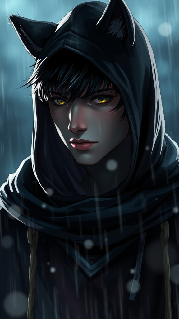 Splash art of a male furry with sleek black fur, wearing a black hooded cloak under the night sky. Cat ears perk up beneath the hood as rain gently falls around him. The scene is dramatically lit from behind, creating striking glow effects. The style is reminiscent of Donato Giancola, delivering an extremely detailed and atmospheric composition. Rendered in UHD HDR 8K for exceptional clarity. Despite the focus on realism, there are subtle hints of fantasy, capturing the mystery and allure of the character. The artwork maintains a cohesive and visually stunning presentation without unnecessary distractions.