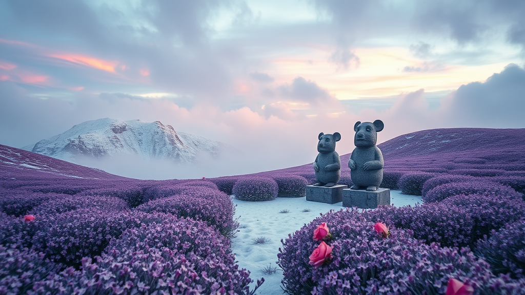Split-level image featuring hills covered in cotton candy hues, nestled in a lavender field with an icy floor. Three statues of mice, resembling ancient moai sculptures, stand amidst a snowy garden maze, evoking a dizzy fairytale ambiance. Bursting with myriad flowers and a few delicate roses, the scene is enveloped by dramatic clouds and colorful mist overhead. The air is filled with fog and feels cold and wet, creating a dreamy, atmospheric vision. Captured in an ultra-wide, hyper-realistic 8k epic composition, the cinematic landscape is reminiscent of artstation landscape photography by Carr Clifton & Galen Rowell. Achieving a 16k landscape vista akin to works by Dustin Lefevre & tdraw, the detailed scene channels the intricate landscapes of Ivan Shishkin, in a style seen on DeviantArt and Flickr. Rendered in Enscape with influences from Miyazaki’s Nausicaa and Breath of The Wild, it showcases 4k detailed post-processing through artstation and is rendered by octane in Unreal Engine. The overall impression is atmospheric and grand, devoid of blue tones.