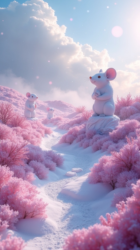 View this AI-generated image featuring a captivating split level scene unfolds with hills draped in cotton candy hues spanning across an indie pink and lavender field the ground below glistens like an icy floor where three intricately carved mouse statues stand amidst a snowy ancient garden these st