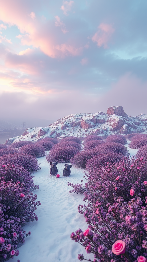 Split-level vista with cotton candy hills, bathed in indie pink hues, nestled in a lavender field. The scene rests on an icy floor, showcasing three mouse statues amid the snow, embodying an ancient moai sculpture style in mouse form. A snowy garden maze unfolds, creating a dizzying, fairytale atmosphere. A myriad of flowers, including a few roses, punctuates the landscape. Above, dramatic clouds and colorful mist hover, shrouded in fog, evoking cold, wet weather. The dreamy ultra-wide shot captures an atmospheric, hyper-realistic composition. This cinematic scene, reminiscent of Carr Clifton and Galen Rowell's photographic landscapes, is rendered in octane for an epic 16K resolution view. It's a fusion of the detailed landscape painting style of Ivan Shishkin and the artistic vision of Miyazaki's Ghibli, akin to "Breath of The Wild." The landscape is then subtly enhanced with 4K detailed post-processing, capturing the essence of an artstation masterpiece, vividly brought to life using Unreal Engine, enriched by Enscape rendering, yet distinctly without any blue.