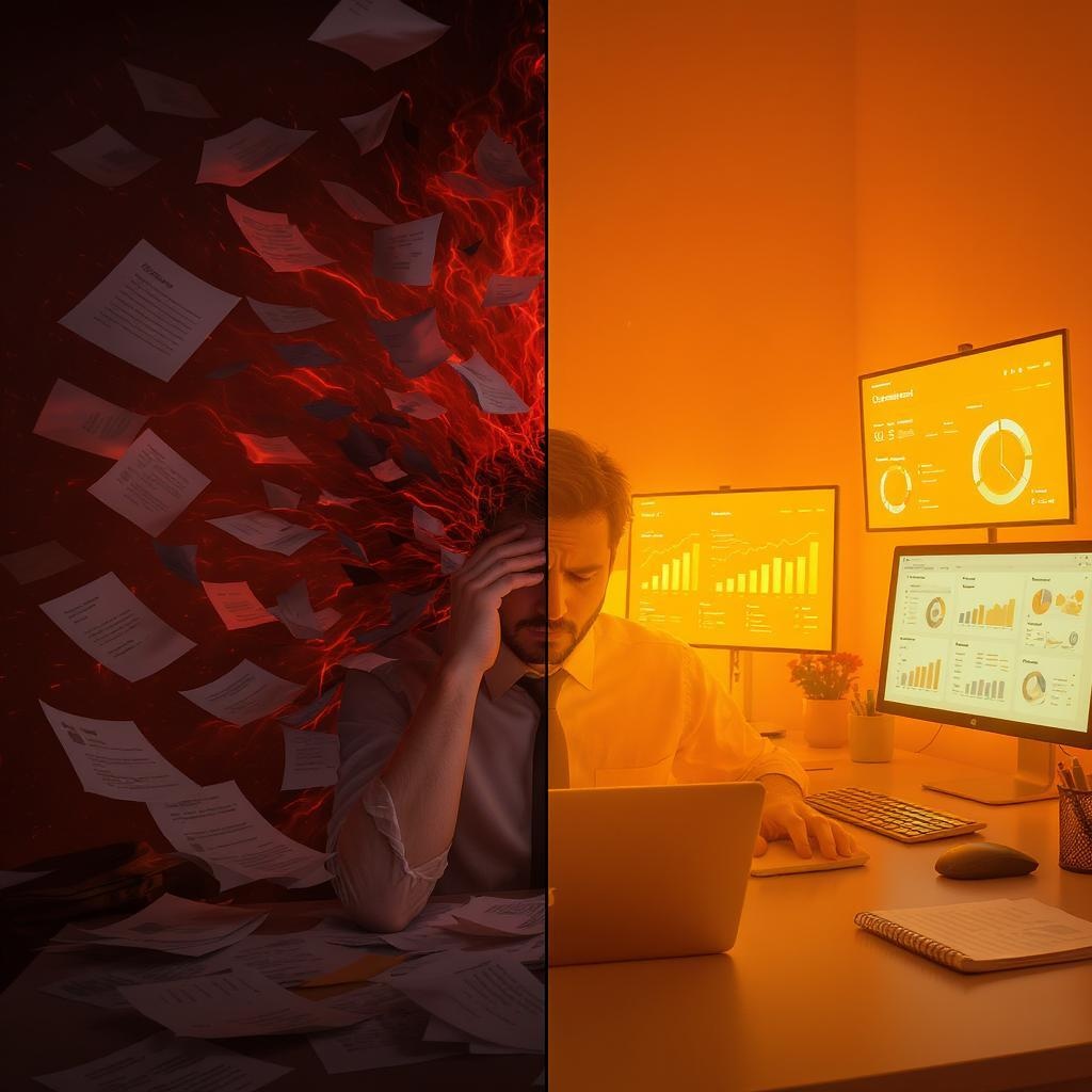 Split-screen concept: On the left, a stressed accountant is surrounded by swirling papers and a chaotic red aura, symbolizing overwhelming pressure and disarray. On the right, the scene shifts to a tranquil and organized office space, enveloped in soothing orange hues, where luminous screens display clear dashboards and digital tools are orderly and accessible. The background seamlessly transitions from deep red to bright orange, representing the gradual shift from chaos to calm efficiency.