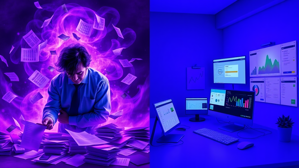 Split-screen concept: The left side features an overwhelmed accountant surrounded by a swirling purple aura, cluttered with scattered papers and palpable tension. The right side transforms into a streamlined, efficient workspace illuminated by soothing indigo hues, showcasing organized digital dashboards and neatly arranged tools. The background transitions from deep purple to vivid indigo, symbolizing a shift from chaos to tranquility and efficiency.