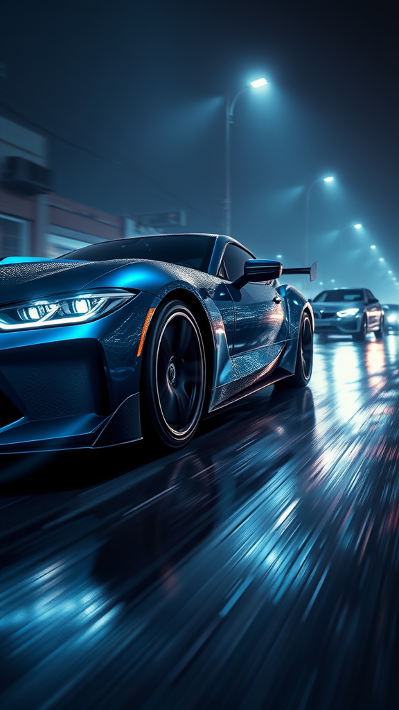 Sport car, shimmering metallic midnight blue paint, aggressive styling, hybrid of BMW and Corvette, full car in motion, sleek and aerodynamic, high-speed chase, cinematic movie action scene on a wet road, underground illegal racing vibe, moody and dark atmosphere, piercing bright headlights, neon cyberpunk aesthetics, Blade Runner-inspired, full view, intricate and detailed digital painting, artstation-level concept art, photorealistic and sharp focus, 8k HDR quality, shallow depth of field, broad lighting, high contrast with dramatic backlighting, ethereal bloom and light sparkles, subtle chromatic aberration, RAW colors vibrant and lifelike, no deformity or ugliness, in-frame with cinematic composition, showcasing a singular sport car, headlights illuminating the path, maintaining immersive underground racing ambiance.