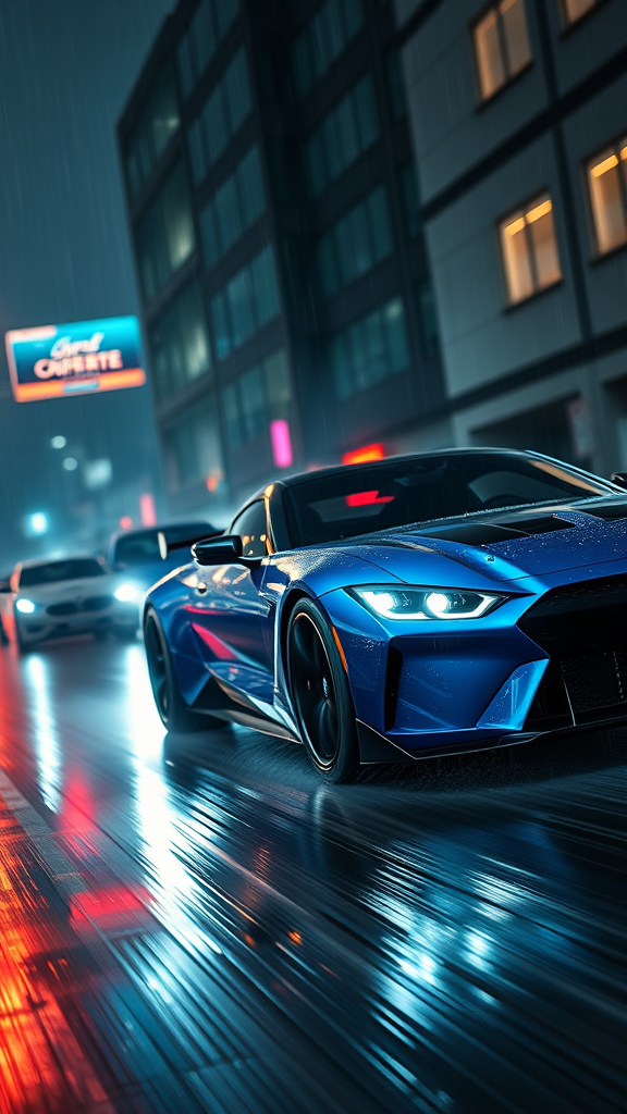 Sport car shimmery metallic blue paint aggressive look tuned BMW and Corvette fusion full car in motion high speed movie action scene wet road illicit racing game moody dark atmosphere bright headlights neon underground aesthetics cyberpunk Blade Runner cinematic cover art full view of a sports car intricate highly detailed digital painting digital art artstation concept art best quality masterpiece photorealistic detailed sharp focus 8k HDR shallow depth of field broad light high contrast backlighting bloom light sparkles chromatic aberration RAW color atmospheric cityscape reflections rain-soaked streets single car headlights illuminating path.