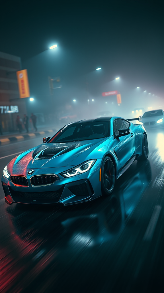 Sport car with a dazzling metallic azure paint job, exuding an aggressive and dynamic presence, a fusion of BMW and Corvette aesthetics, caught in high-speed motion. Set in a thrilling movie action scene, it races on a slick, rain-soaked road amid an illicit racing competition. The moody, shadowy environment is pierced by bright headlights and vibrant neon accents reminiscent of underground cyberpunk worlds. The atmosphere echoes Blade Runner vibes, captured in a cinematic, cover-art-worthy depiction. The focus is on a single, intricately detailed sports car, mastered in digital artistry, suitable for an ArtStation gallery, boasting unparalleled quality at 8k HDR resolution. The scene features a shallow depth of field, broad and contrasting lighting, with backlit elements casting bloom and light sparkles. Chromatic aberration and sharp focus are key, presented in a RAW color photo that’s perfectly framed, untouched by deformities.