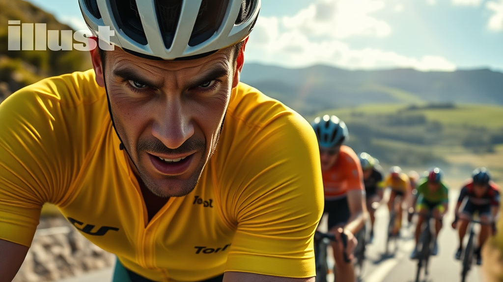 Sports Illustrated cover photo, Tour de France, Yellow Jersey, rider intensely focused, muscles taut under the bright sun, vivid landscapes of the French countryside in the background, peloton in pursuit, dust and determination in the air, dynamic motion captured, a blend of shadows and highlights accentuating the cyclist's features, sweat glistening, veins visible, the thrill of competition palpable, photorealistic style with an emphasis on the intensity and drama of athletic excellence, dynamic angles, colors vivid and lifelike, embodying the spirit of endurance and triumph.