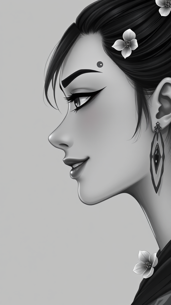Spot color, grey background, distinctive facial mark, parted lips, defined nose, visible teeth, highly realistic, subtle smile, gazing off to the side, angled profile, inspired by Dota 2 character Dark Willow, single figure, monochrome palette, adorned with earrings and jewelry, greyscale tones, delicate flower accent, focused on lips and profile, side portrait capturing thoughtful expression.
