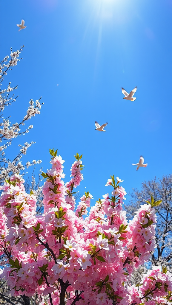Springtime joy bursts forth with vibrant blossoms under a clear blue sky, surrounded by gently swaying trees and the sweet melody of birdsong. The scene is a radiant embrace of warmth and renewal, where nature flourishes in perfect harmony, inviting all creatures to bask in its serene beauty.