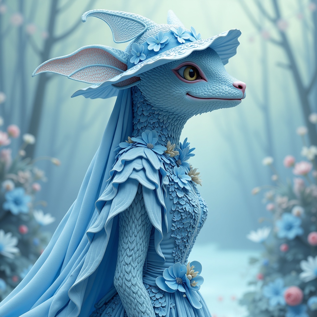 View this AI-generated image featuring a clandestine spy adorned with intricate blue camouflage resembling delicate porcelain artistry her elegant figure draped in timeless fashion with exquisite details inspired by mythical creatures featuring flowing forms and pastel hues the scene is infused with
