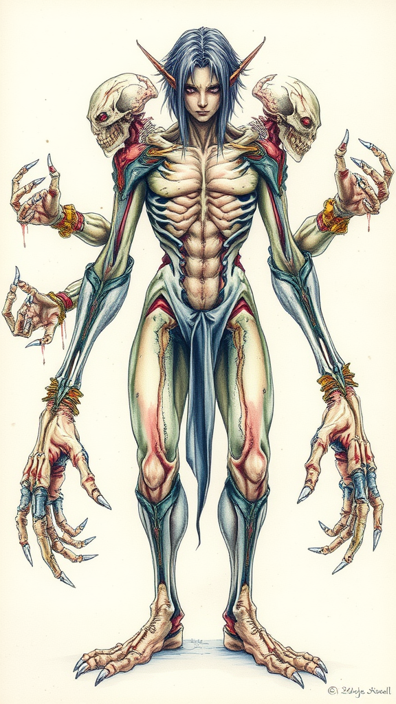 Squall Lionhart, Final Fantasy VIII inspired character, surreal and intricate details, watercolor style, influenced by H. R. Giger. Multiple legs, heads, arms, and hands merge into a distorted figure, with severed and intertwined body parts. An otherworldly appearance with abstract, warped anatomy—erratic fingers with variations and anomalies. Low resolution, lacking sharpness, blurred features, remnants of digital artifacts, and text or watermarks. A composition teetering between fantastical imagination and chaotic abstraction.