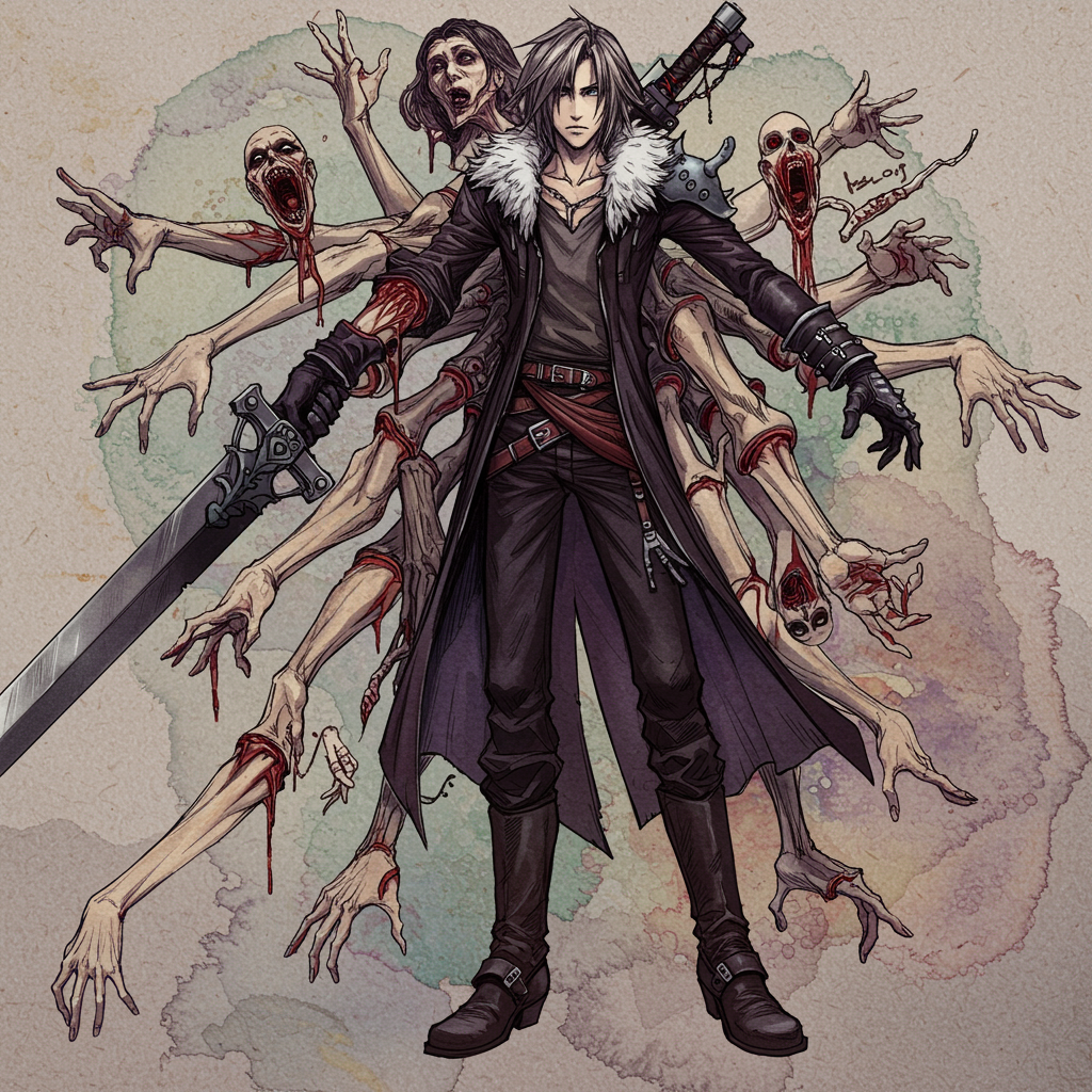 Squall Lionhart in Final Fantasy VIII style, inspired by intricate and surreal H. R. Giger aesthetics, featuring a fusion of multiple limbs and heads, distorted anatomy, intertwining hands, and elongated legs. The chaotic composition includes severed appendages juxtaposed against an abstract watercolor background, blending elements of low and normal quality with intentional imperfections such as jpeg artifacts, blurriness, and textural distortions. Subtle hints of signatures and watermarks faintly appear amidst the complex imagery, embodying an experimental and otherworldly portrayal.