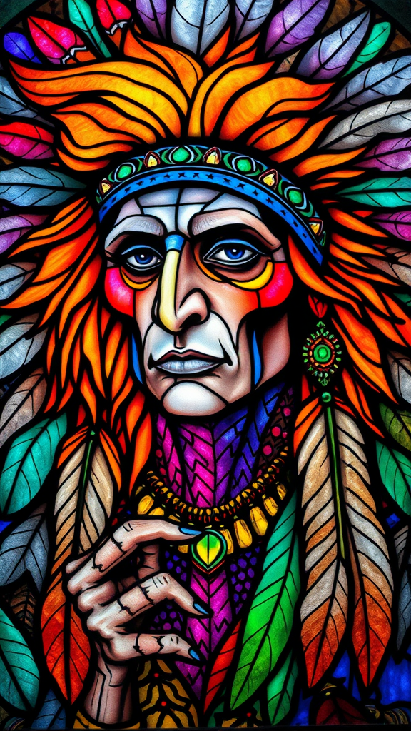 st41nedg, stained glass depicting an intensely psychedelic portrait of a Native American figure, adorned with feathers, bursting with vibrant colors, flowing orange hair, UHD, HDR, 8K, featuring a surreal and abstract design, with unique and avant-garde facial expressions, asymmetrical eyes, elongated neck, unusual hands, strikingly distinctive features, maintaining a focus on artistic imagination, avoiding low resolution, ensuring clarity and cohesion without artifacts or distractions, seamlessly integrated into a complete and coherent artwork.