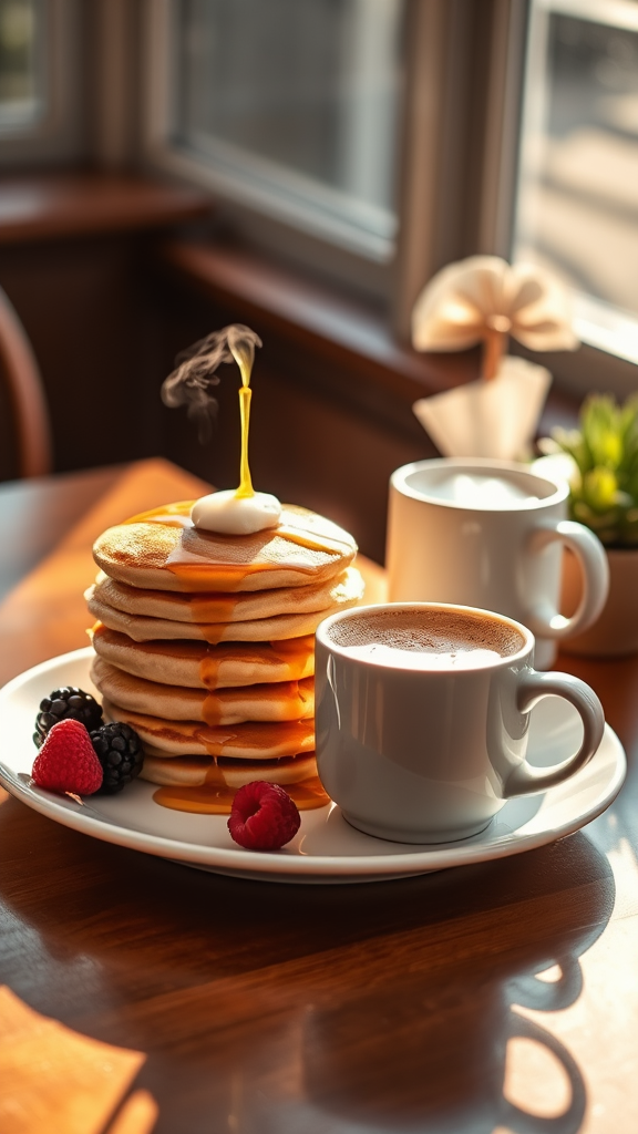 Stacks of fluffy pancakes rest elegantly on a white plate, draped with a generous drizzle of golden maple syrup, steam gently wafting upwards. Beside them, a steaming cup of cappuccino sits invitingly, its frothy surface artistically textured, on a polished wooden table. Two vibrant berries accompany the pancakes, adding a pop of color. The morning sunlight filters through a nearby window, casting a gentle sun glare that dances across the scene. The professional color grading enhances the warmth of the setting, with soft shadows and a balanced contrast creating a serene atmosphere. The photograph captures every detail with clean, sharp focus, enveloped in a hyper-realistic, dreamy bokeh effect. Bathed in a warm, soft light, this idyllic breakfast scene is shot with an f-stop of 2.0, in an aspect ratio of 9:16.