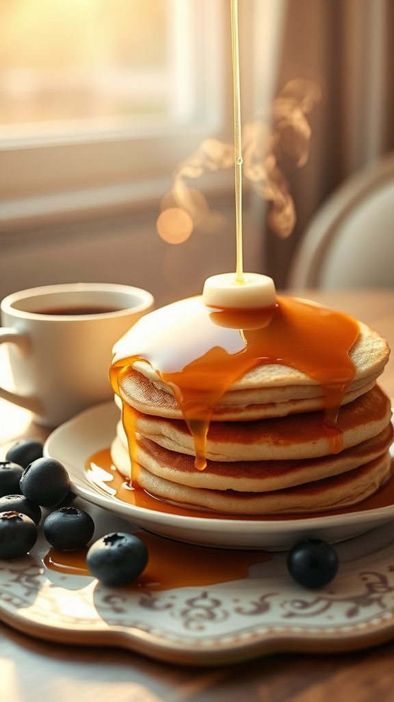 Stacks of fluffy pancakes rest on a vintage ceramic plate, cascaded with glistening golden maple syrup, delicate steam wafting gently upwards; a steaming cup of cappuccino sits invitingly beside them, its rich aroma blending with the sweet scent of syrup and fresh pancakes. A pair of plump blueberries adds a splash of color next to the pancakes. The early morning sunlight filters through the window, casting a gentle glow and creating charming sun glares on the table, with professional color grading rendering the scene in warm soft tones and soft shadows, capturing the serene morning ambiance. The image boasts clean sharp focus and hyper-realistic details, with a mesmerizing bokeh effect softening the background. The warm light and composition are crafted with f-stop 2.0 in mind, creating an intimate, tranquil breakfast scene in a 9:16 ratio.