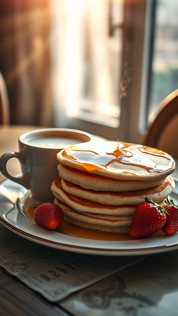 Stacks of fluffy pancakes rest on an elegant ceramic plate, drizzled generously with golden maple syrup, a delicate wisp of steam rising from them. Beside the pancakes sits a steaming cup of cappuccino, its frothy surface swirling with intricate patterns. A pair of plump, juicy strawberries are nestled next to the pancakes, adding a vibrant pop of color. The entire scene is bathed in the soft, warm glow of morning sunlight streaming through a nearby window, creating gentle sun flares that dance across the table. The photograph is captured with professional color grading that highlights the rich hues and textures, with soft, subtle shadows and no hard contrasts. The focus is pristine and sharp, bringing out the hyper-realistic detail of each element, while the background is elegantly blurred with aesthetic bokeh. The ambiance breathes warmth, captured with an f-stop of 2.0, making it a perfect composition of a leisurely morning breakfast --ar 9:16.