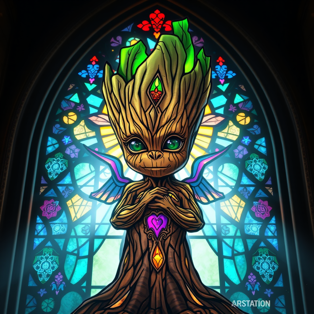 Stained glass depiction of a cherubic Groot, featuring intricate and colorful designs, exuding a vibrant glow that evokes a sense of the divine. Set within a richly detailed Gothic cathedral window, the piece is backlit, casting a radiant aura. This digital painting concept, reminiscent of art by Clive Barker, H.R. Giger, and Brom, brings a mesmerizingly surreal quality, trending on Artstation.
