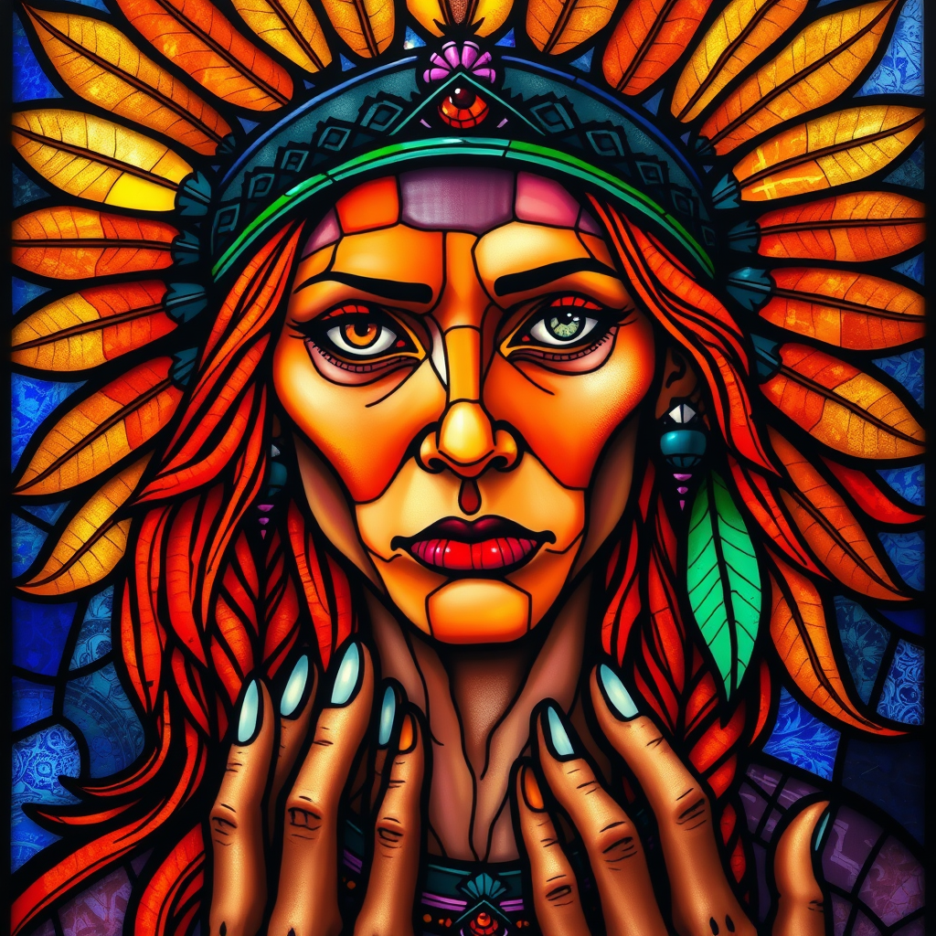 stained glass representation of an intensely psychedelic portrait of a North American Indian, vivid feathers in her hair, radiant colors, orange flowing hair, in ultra-high definition, high dynamic range, 8K, featuring a slightly abstract edge with unique facial features, intriguing eyes, elongated neck, multiple fingers, artistic hands, with a focus on vibrant aesthetics and detailed complexity, yet maintaining clarity and avoiding low resolution or distortion, ensuring no visual distractions such as logos, text, or artifacts, capturing the essence in a seamless and cohesive composition.