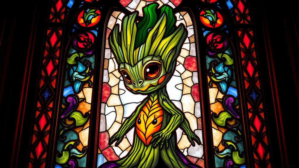 Stained glass window of a whimsical creature inspired by baby groot, intricate and colorful, glowing with an ethereal light, designed in a religious and gothic cathedral style, backlit for a radiant effect. Highly detailed and trending on Artstation, this concept art digital painting blends the styles of Clive Barker, H.R. Giger, and Brom, merging dark fantasy elements with vibrant hues, capturing a sense of the mystical and surreal.
